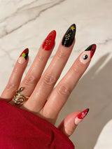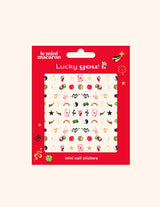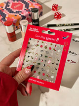 Et sjovt og farverigt ark med negleklistermærker fyldt med symboler for held og positiv energi. Fra yin/yang og terninger til regnbuer og vinkekatte – hvert design tilføjer et unikt og legende touch til dine negle. Perfekt til at skabe et personligt udtryk med et strejf af held.
