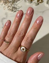 1. Påfør et lag af en valgfri Le Mini Macaron single gel polish, som skal bruges som din grundfarve og hærd. Giv den endnu et lag gellak, så farven er helt dækkende på neglene. Hærd den gerne kun halvdelen af den sædvanlige tid (ca. 15 sekunder), så den efterlader gellakken en smule klistret. Dette er for at krompulveret vil hæfte bedre til gellakken.
